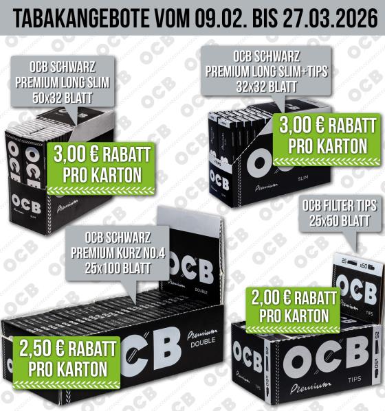Beim Kauf von einem Karton OCB schwarz Premium long slim+Tips /32x32 Blatt erhalten Sie 3,00 Euro Rabatt