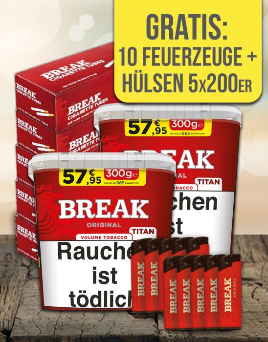 Beim Kauf von 2x Break Original Titan Box 300g erhalten Sie 10 Break Feuerzeuge und ein Gebinde Break Hülsen gratis dazu.